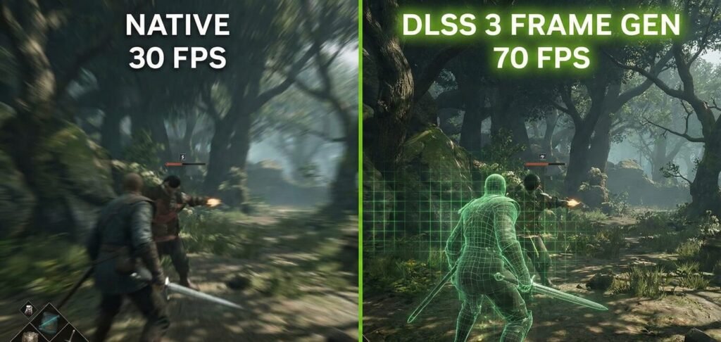 - How it works: The game might natively run at 35-40 FPS (which feels sluggish). You turn on “Frame Generation,” and the AI inserts fake frames in between the real ones.